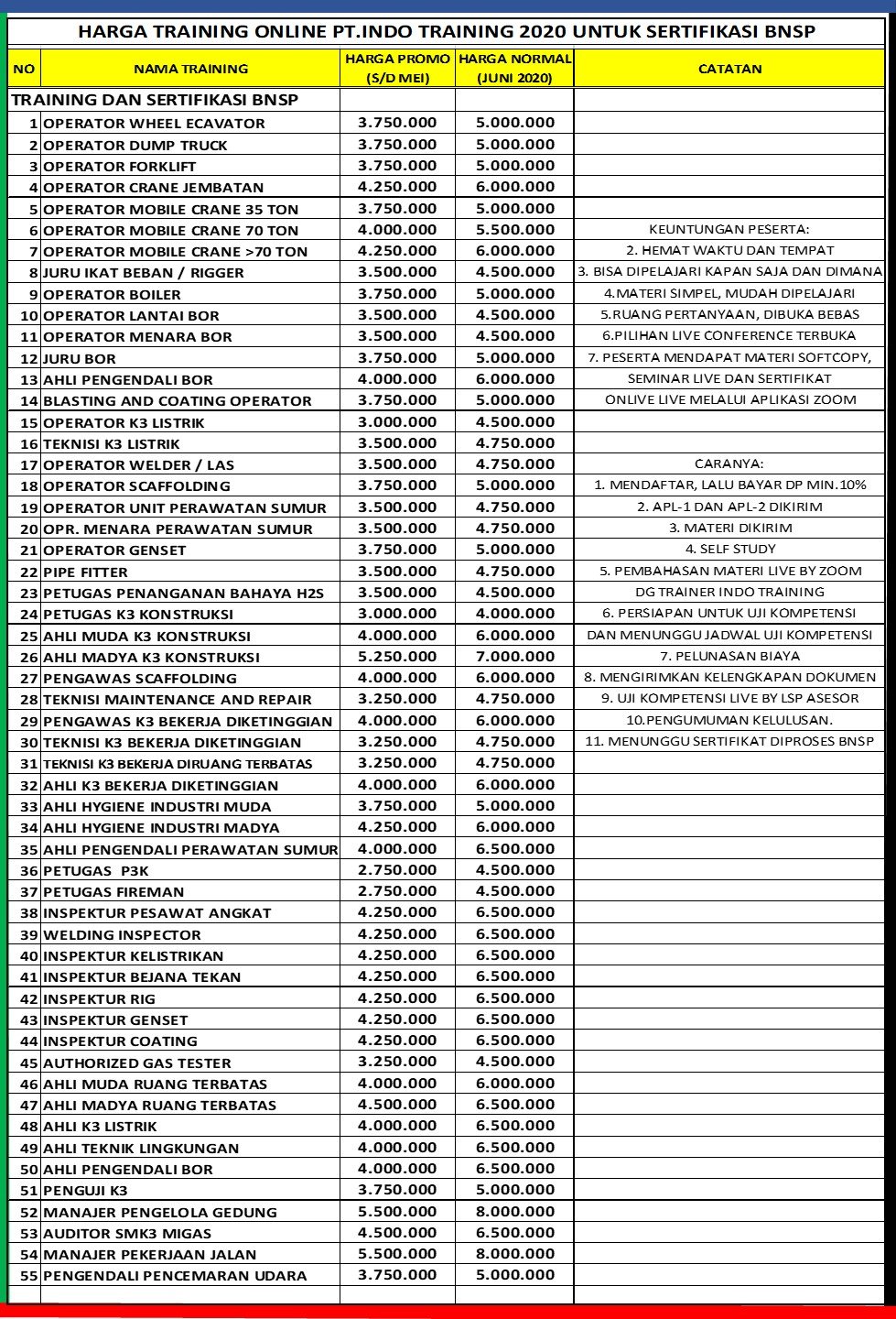PT. Indo Training menawarkan pelatihan online bersertifikat resmi BNSP untuk periode Mei - June 2020. Untuk Harga online training BNSP seperti dibawah ini.